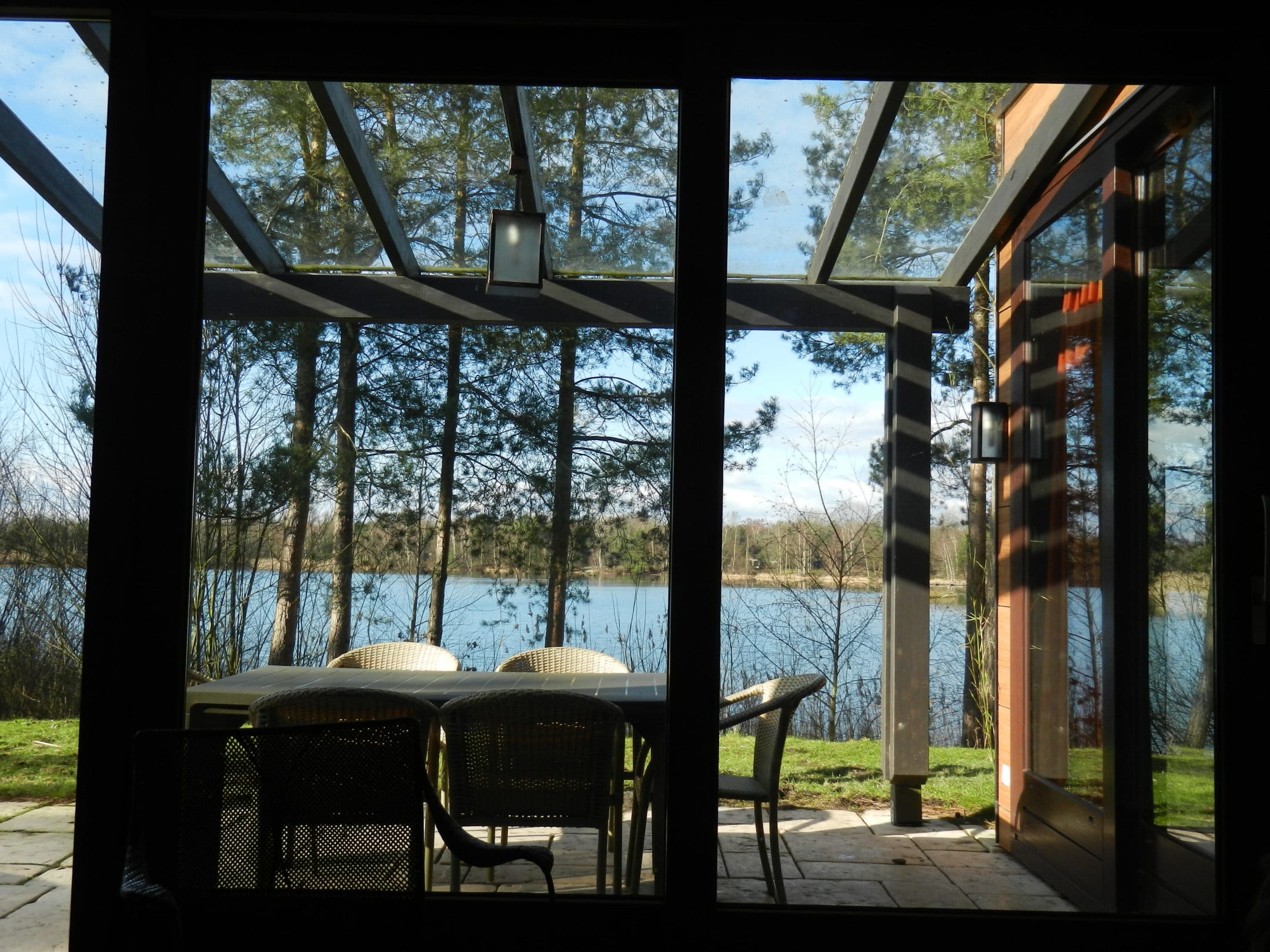 Der Blick auf die Veranda und den See vom Wohnzimmer