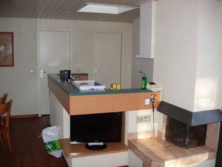 Wohnzimmer mit Blick auf die Küche/ Kamin