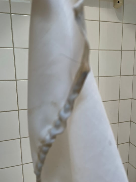 Vergilbter dreckiger duschvorhang.