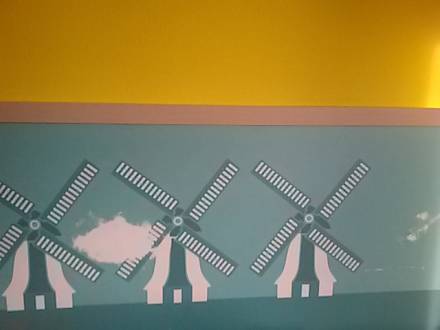 Anfang des Jahres komplett renoviert und sieht so aus. . Mehrere Windmühlen mit Krankenhaus türkisem Hintergrund, darüber knallgelb gestrichener Putz, gesteifte Vorhänge - so unschön ist es an der Nordsee.