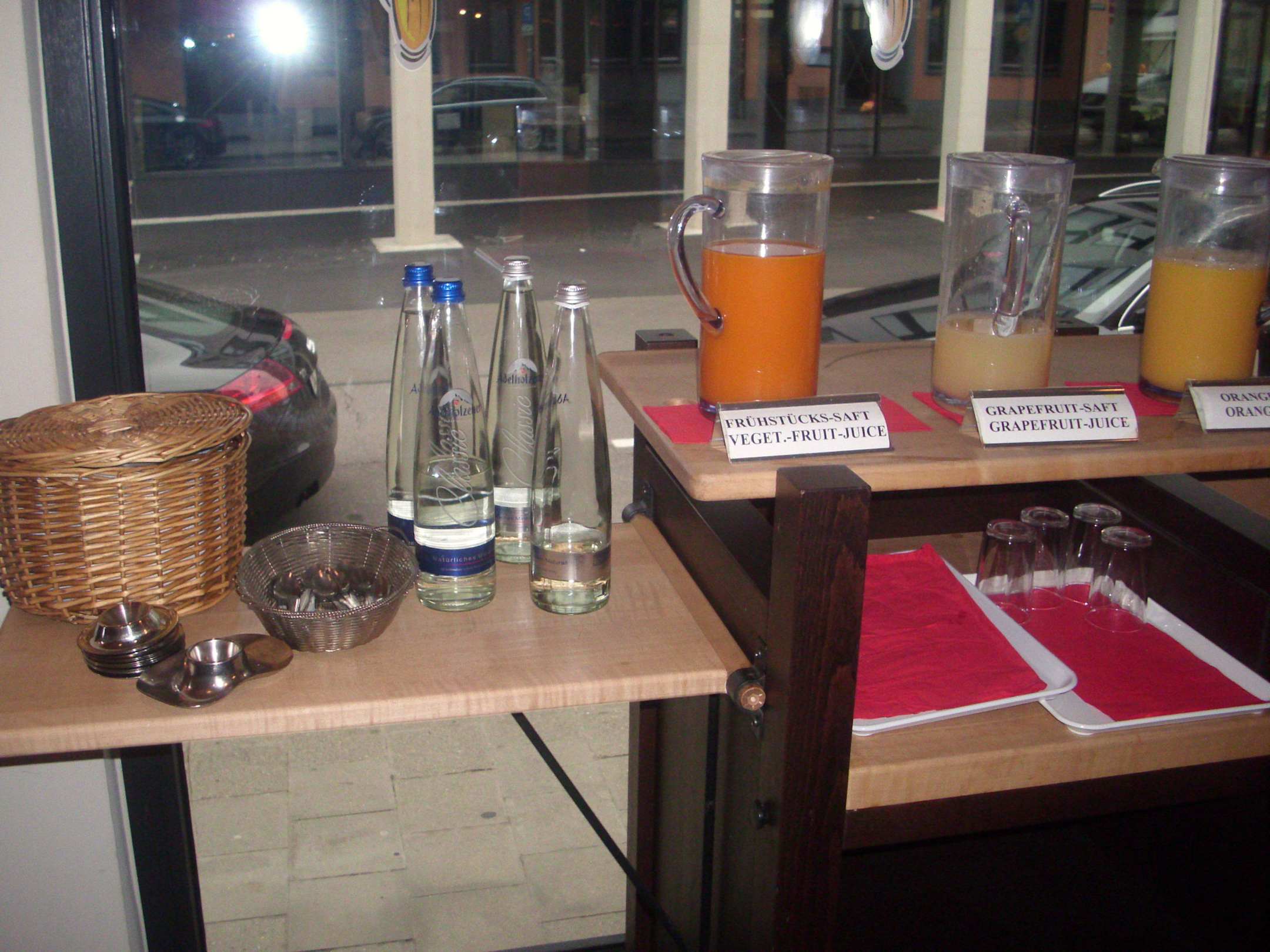 Teil vom Frühstücksbüffet. Gekochte Eier, Wasser, Säfte usw.