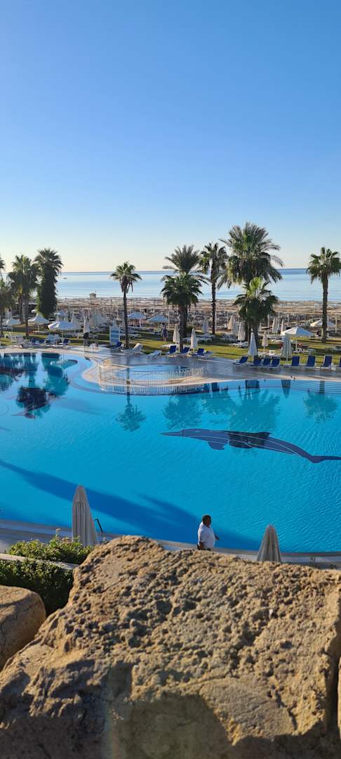 Blick vom Restaurant auf Pool und Strand