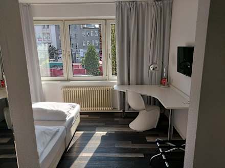 Blick von der Eingangstür ins Zimmer. Im Hintergrund sieht man den Spielbudenplatz.