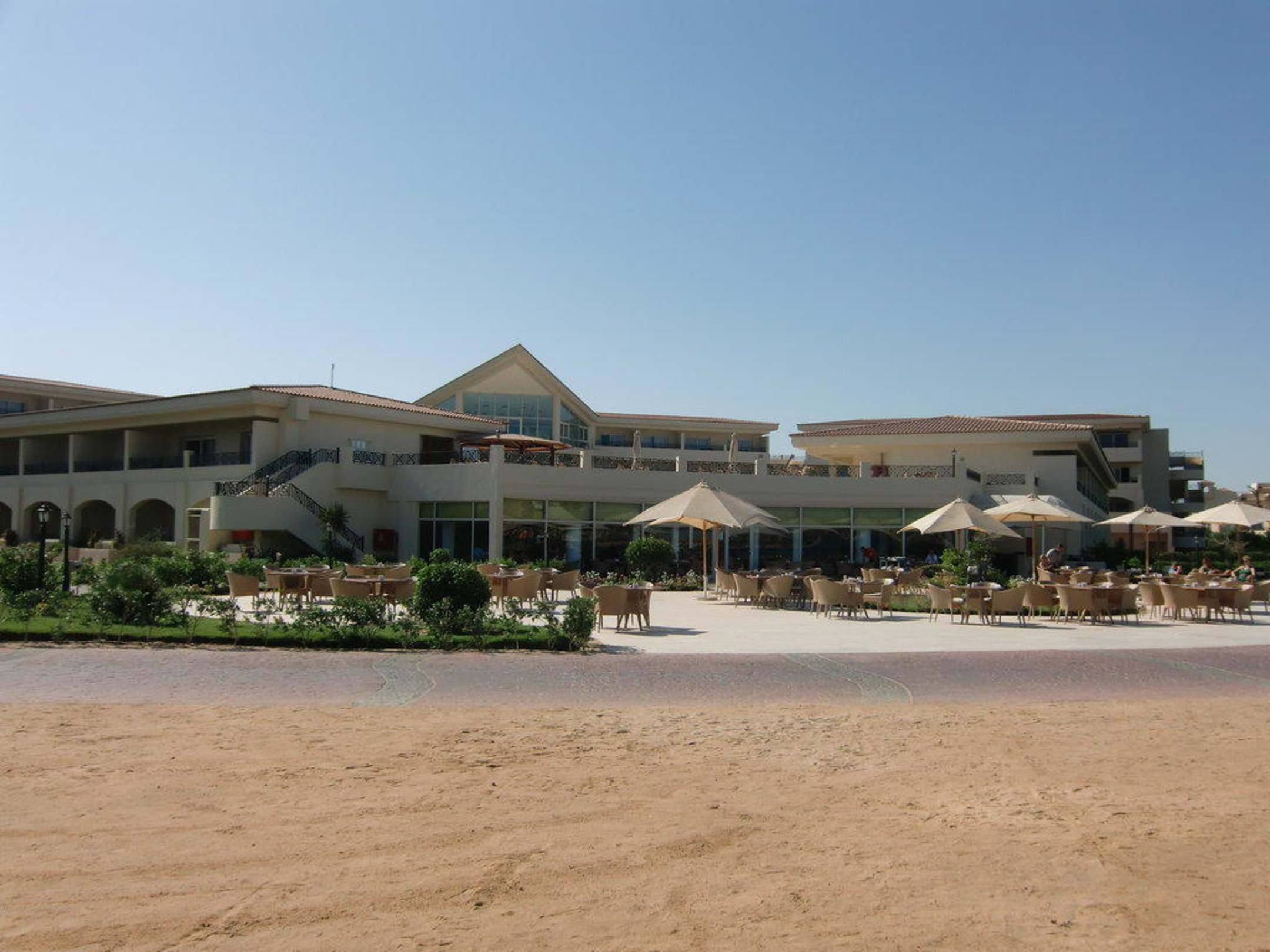 Blick vom Strand auf Hotel und Restaurantbereich