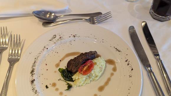 Ein vorbereiteter Teller vom Buffet mit Rinderfilet und Kartoffelpürre