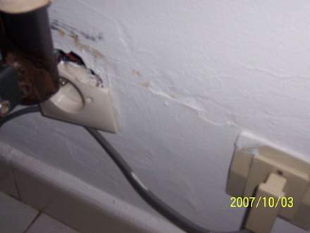 Defekte Steckdose neben Metallbett