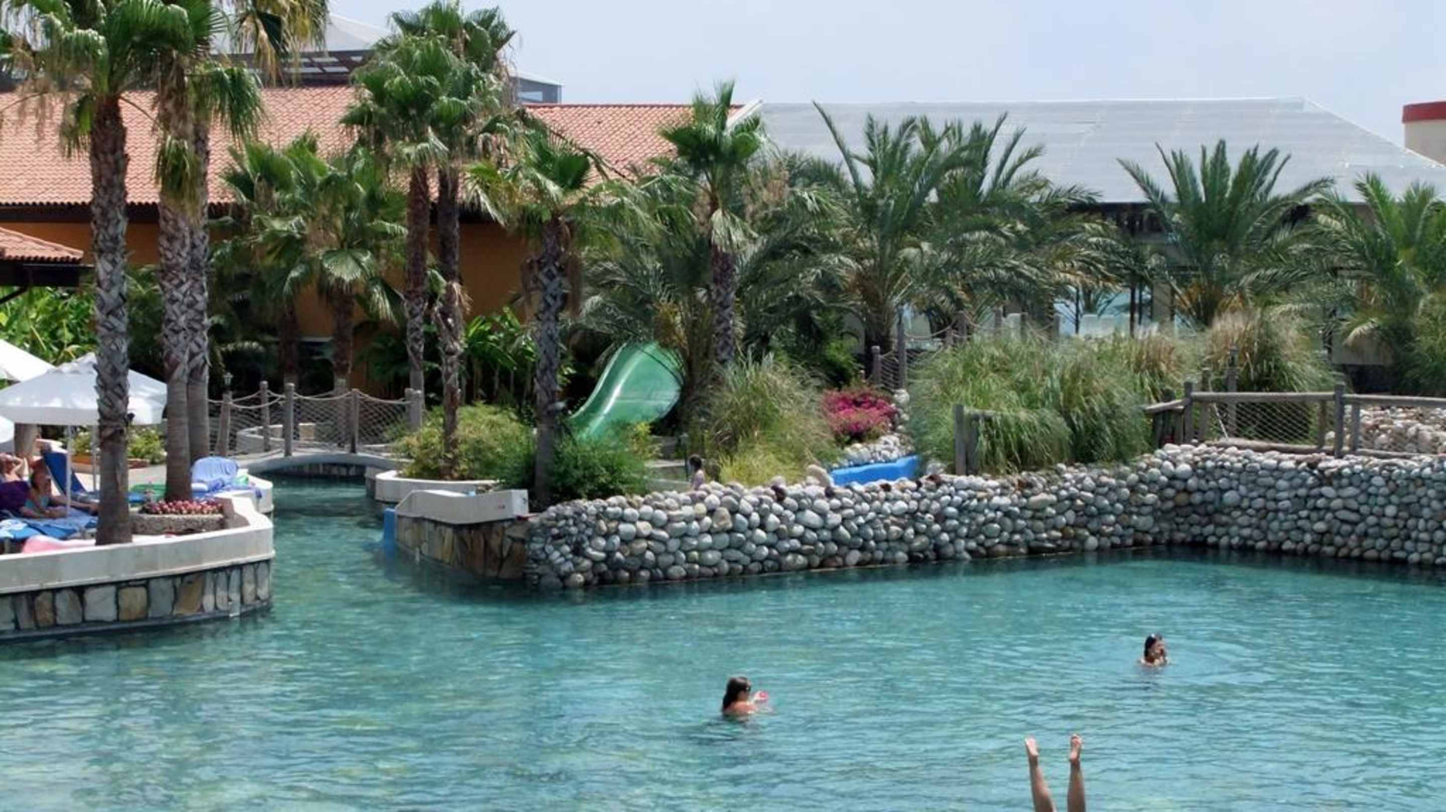 Blick auf die Rutsche und den kleinen Crazy River