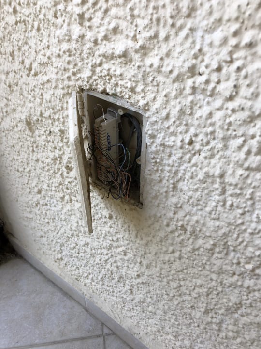 Offene Stromkabeldose in der Terrasse.