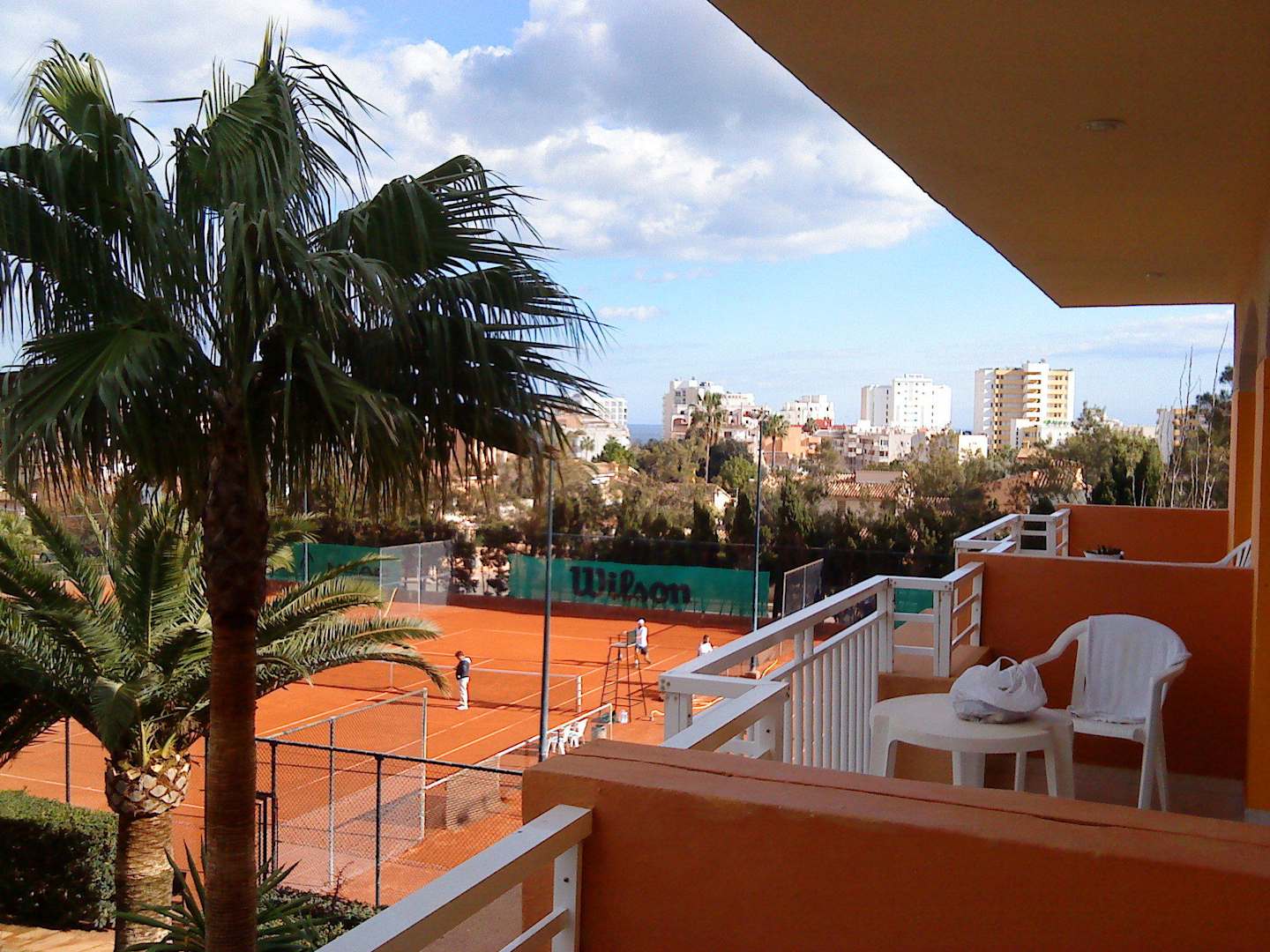 Blick vom Balkon auf Tennisplätze und Cala Millor