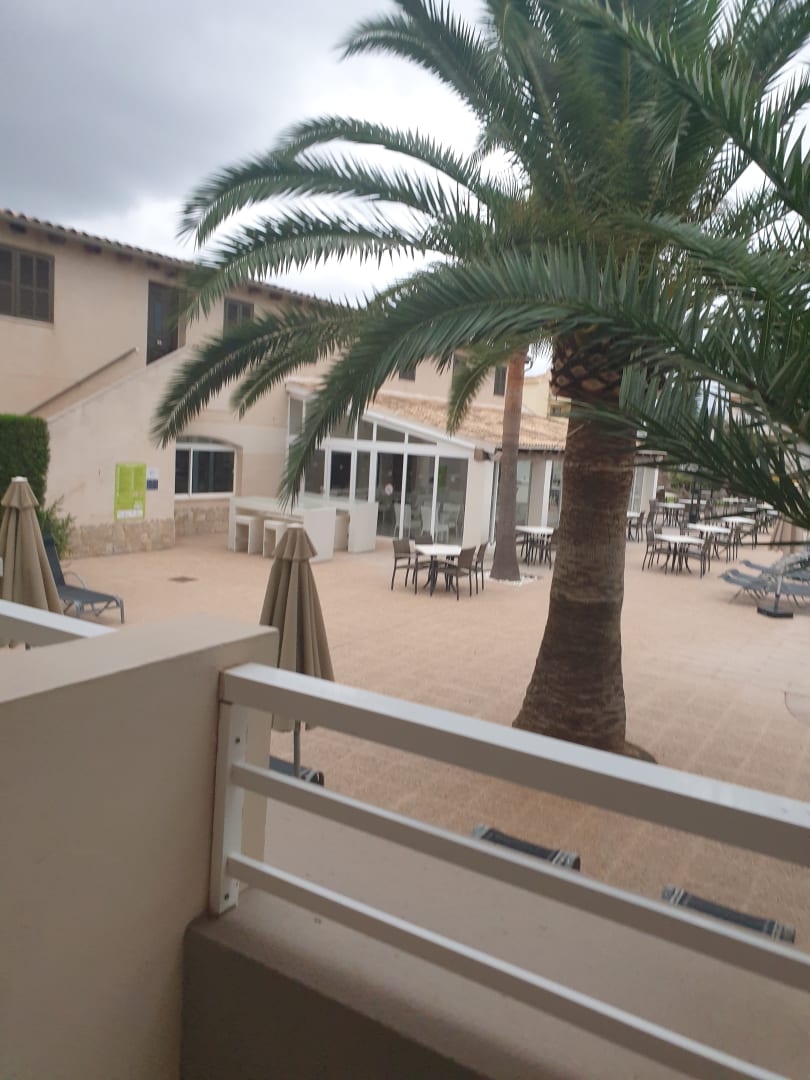 Blick vom Zimmer auf die Aussenterasse vor der Poolbar