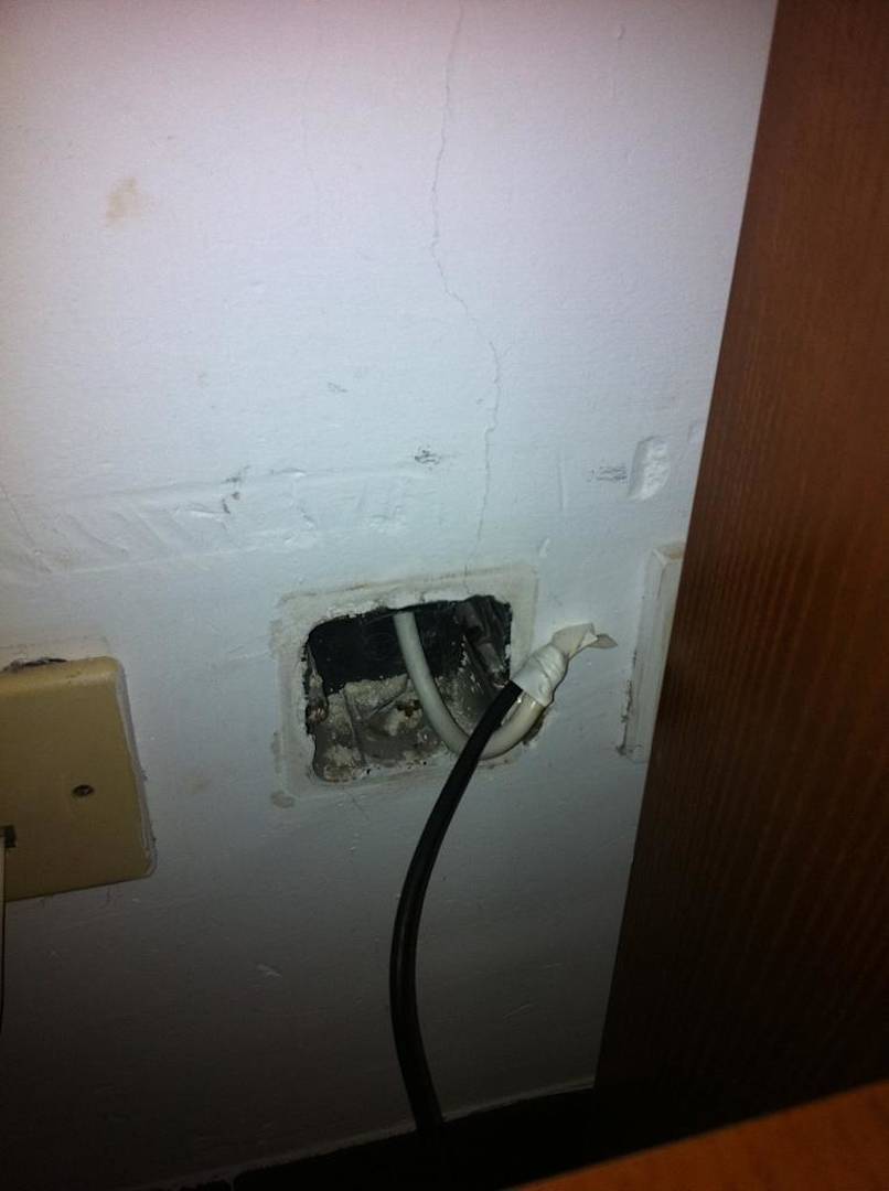 eine offene Steckdose hinterm Fernseher
