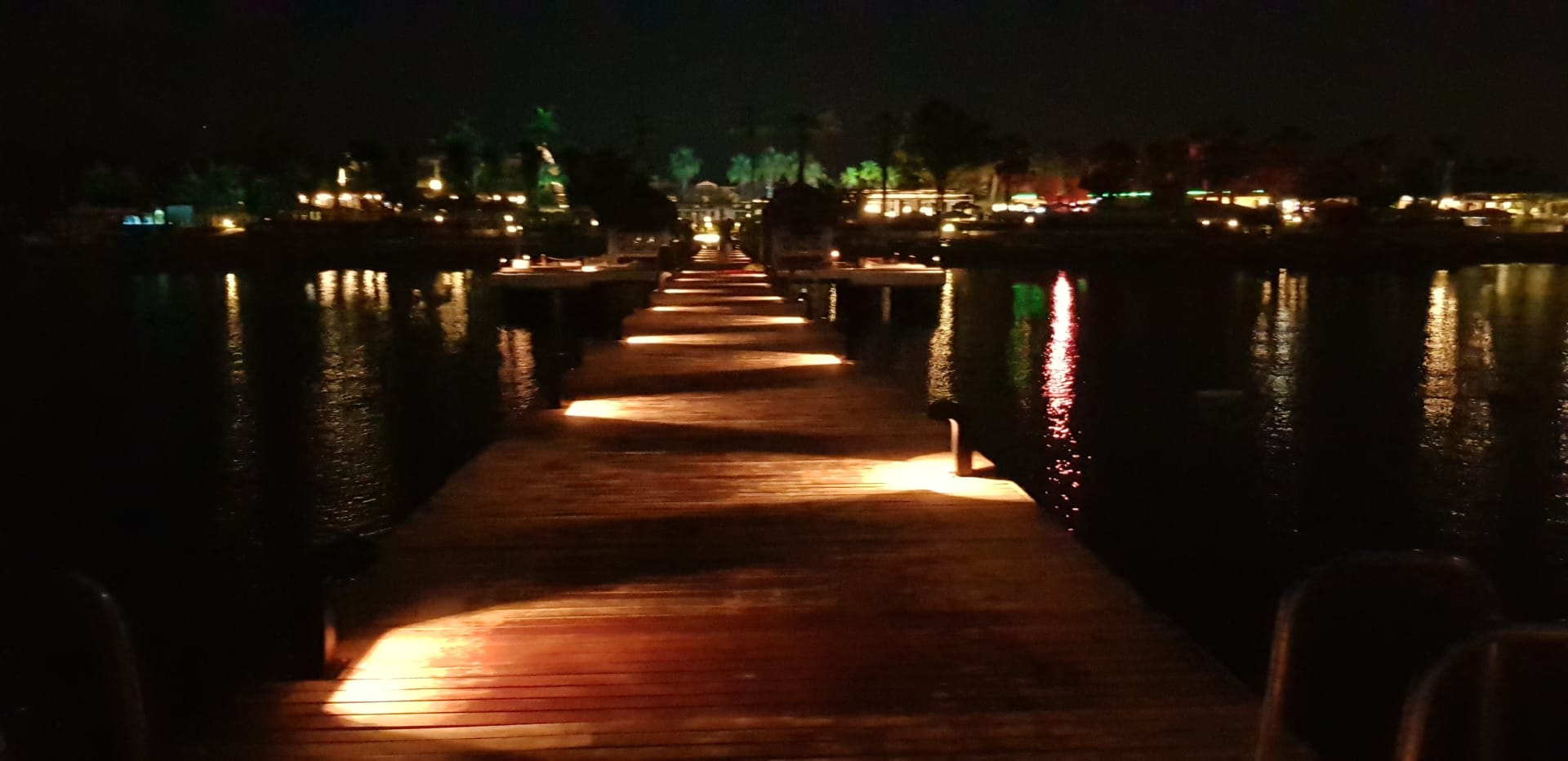 Blick bei Nacht vom Steg in Richtung Hotel