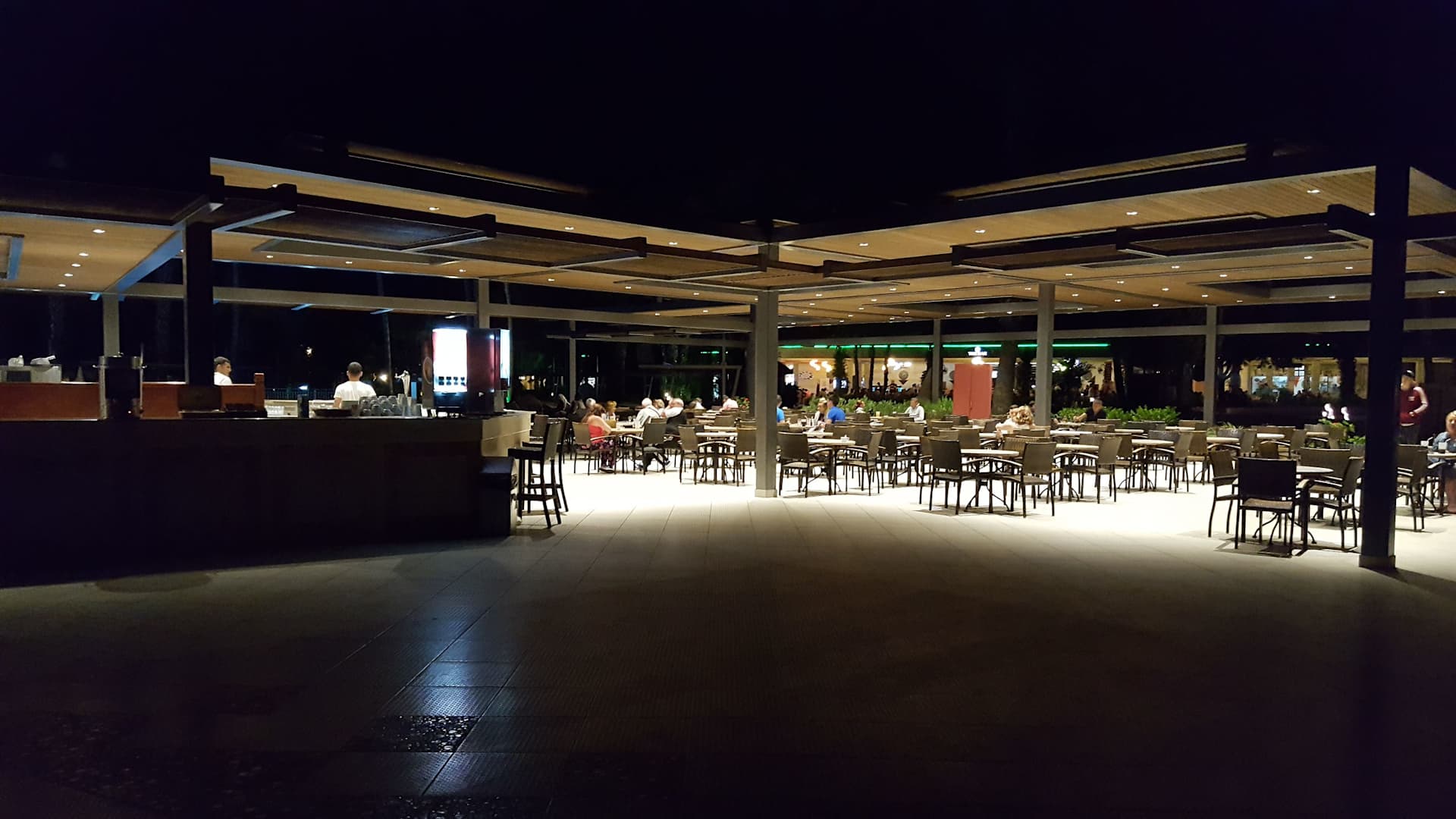 Poolbar und Sitzmöglichkeiten am Abend