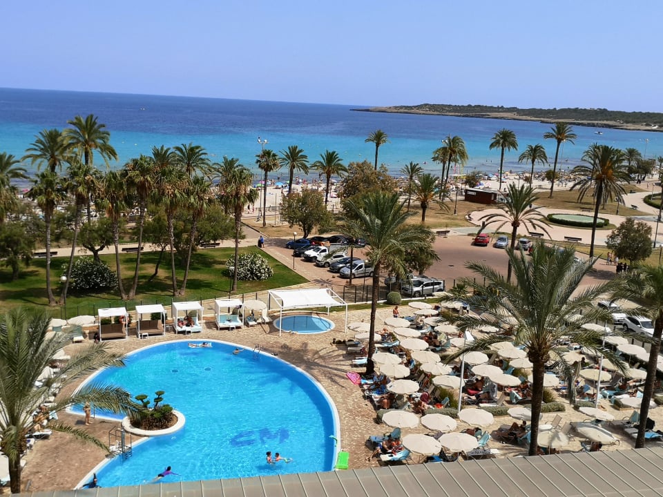 Blick vom Balkon über die Poolanlage aufs Meer