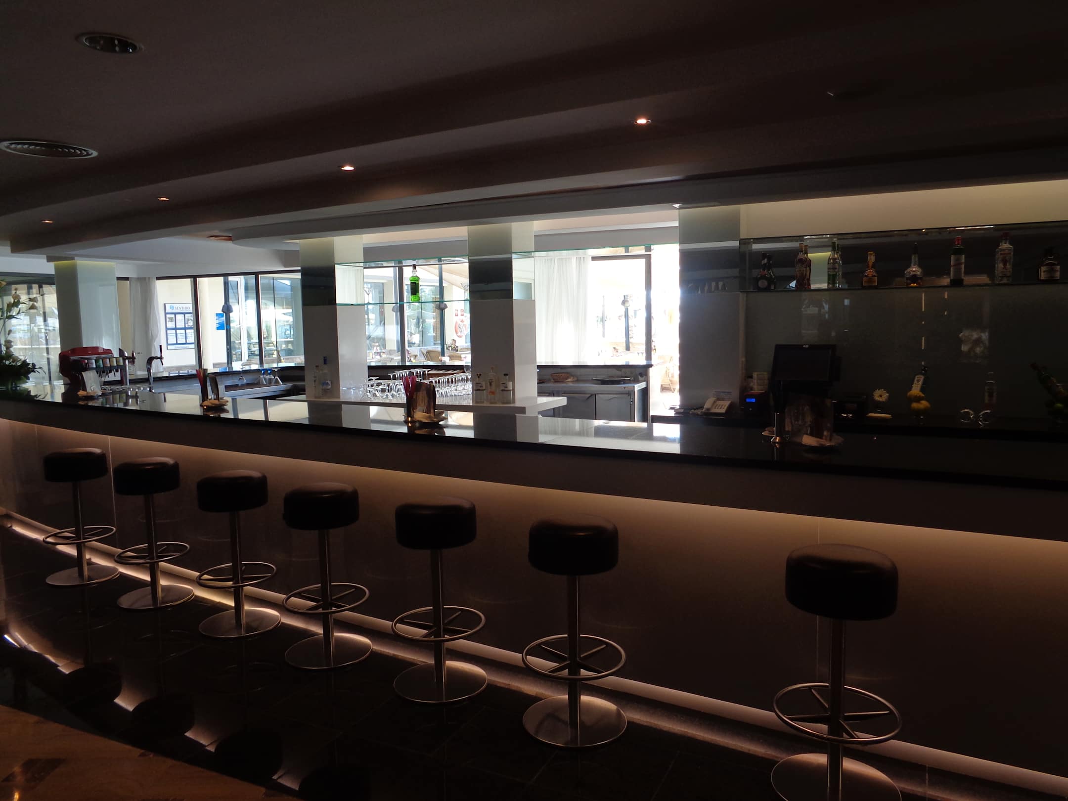 Bar und im Hintergrund die Tür zu Poollandschaft.