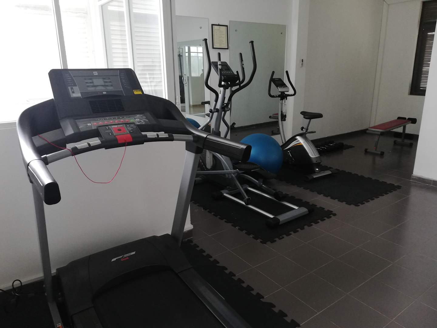 Der Fitnessraum. Im kleinen Kämmerlein im dritten Stock ohne wirkliches Fenster.