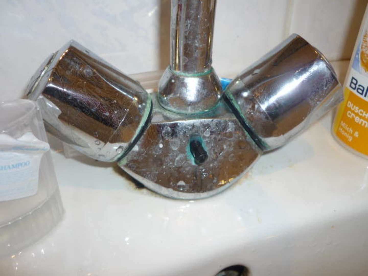 Nicht gereinigter Wasserhahn. Bildung von grünem, undefinierbaren Schmutz