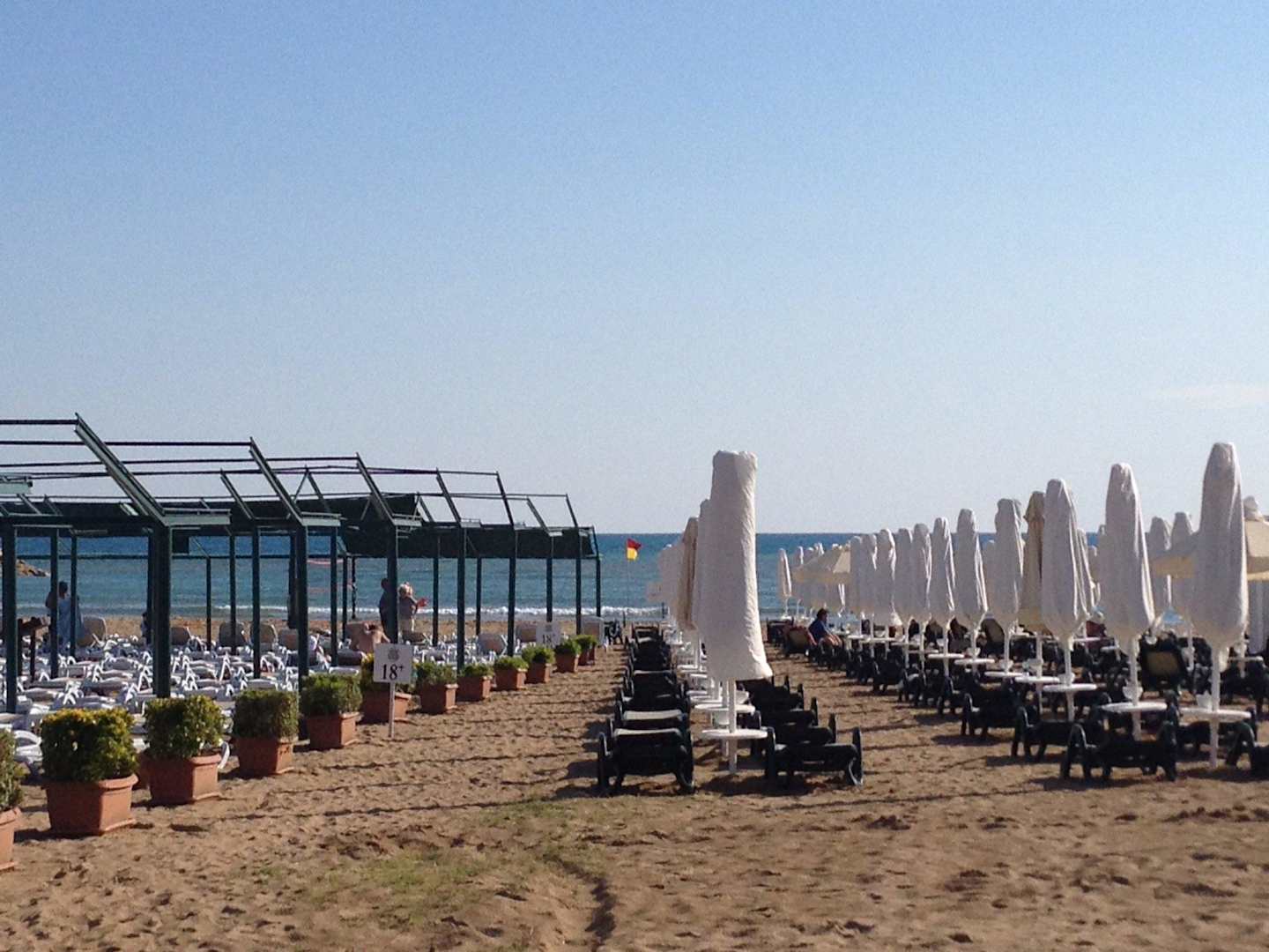 Strand mit Blumenkübeln als LärmschutzUm eine Abgrenzung zu den anderen Bars und deren Lärm zu schaffen, hat man ein paar Blumenkübel am Strand aufgestellt. Sinnfreies 18+ Konzept, wenn Kinder nur 3 Meter entfernt Krach machen.