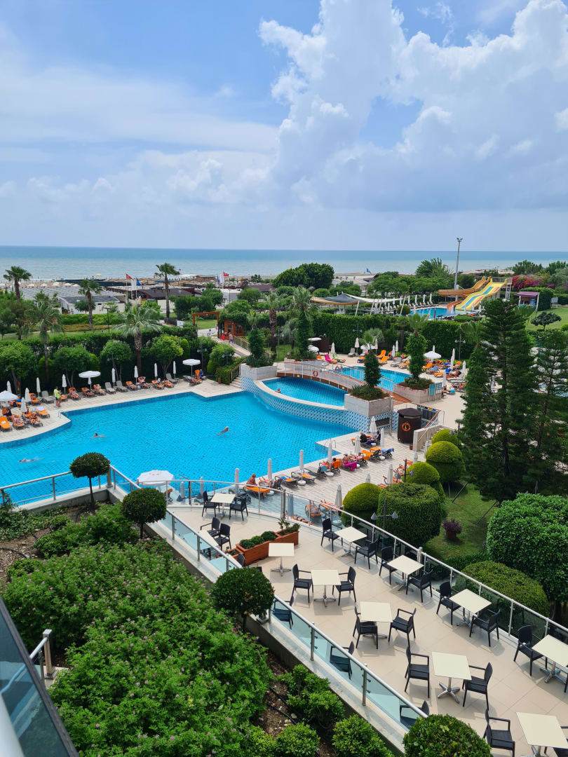 Balkonausbluck auf einen Teil der Aussenterrasse und Pool