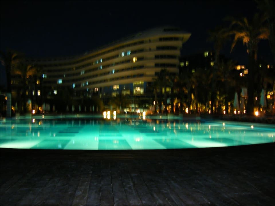 Zwembad en hotel by night