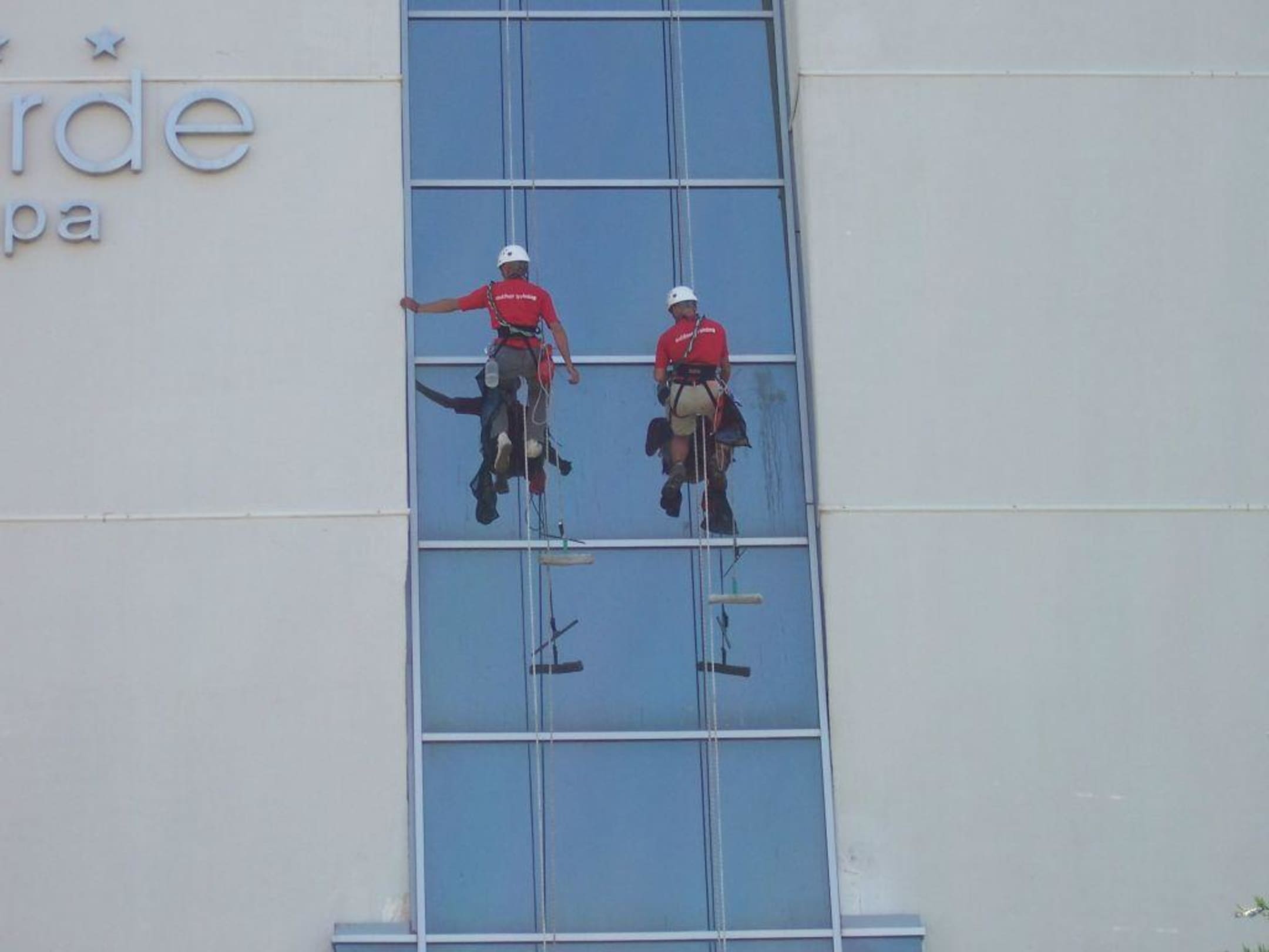 Arbeiten für AndereFensterputzer bei der Arbeit. Sie Reinigten die Fenster an der Seitenansicht des Hotels