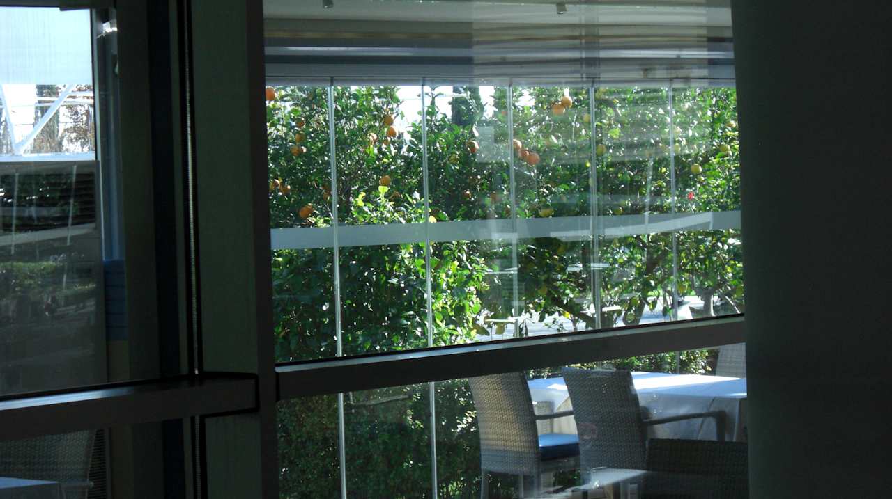 Blick auf Zitronen und Orangenbäume vom Restaurant