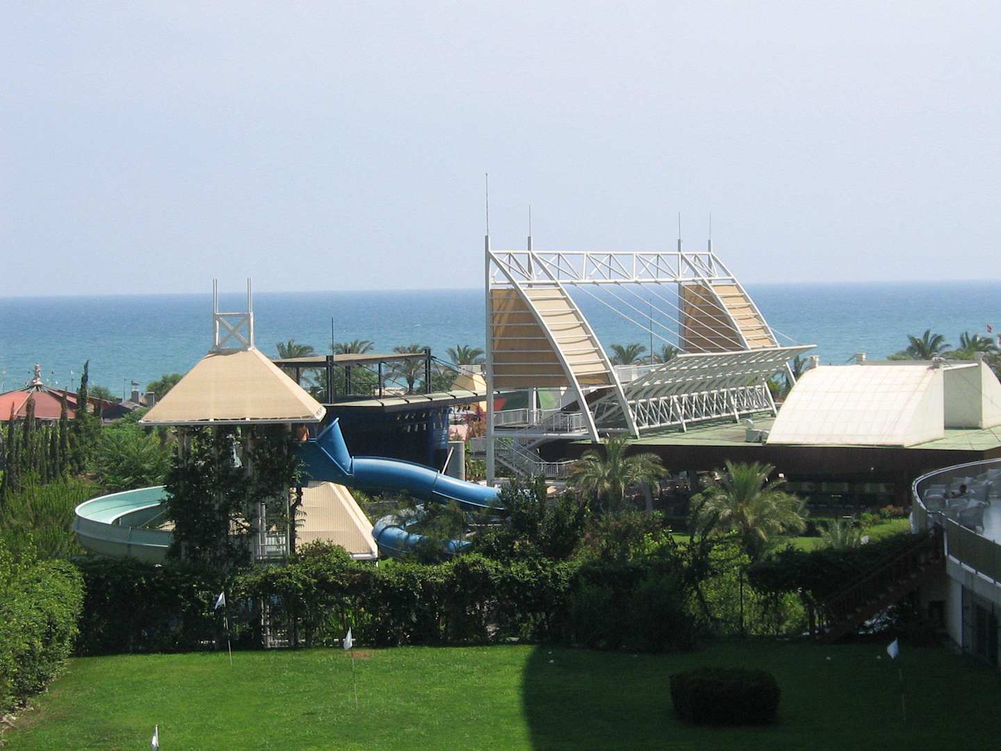 Ausblick auf Hotelanlage und Meer vom Balkon