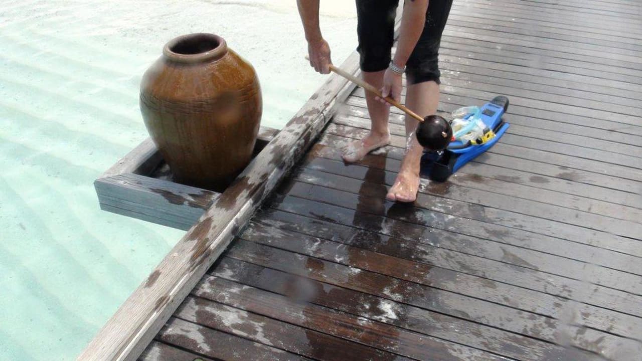 Die Stege zu den Watervillas werden extrem heiss. Alle 50 Meter hat es solche Kübel. Wegen des idiotischen Stiels kann man das Wasser aber kaum bequem auf die Füsse giessen. Es gibt auch hier bessere Lösungen