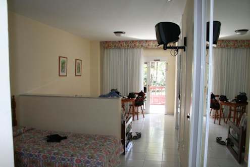Studio vom Eingang Richtung Balkon, etwas Farbe und ein wenig spanische Gemütlchkeit fehlt dem Zimmer schon. Studio ist komplett eingerichtet mit Küche, Besteck, Gläsern, Töpfen, ...
