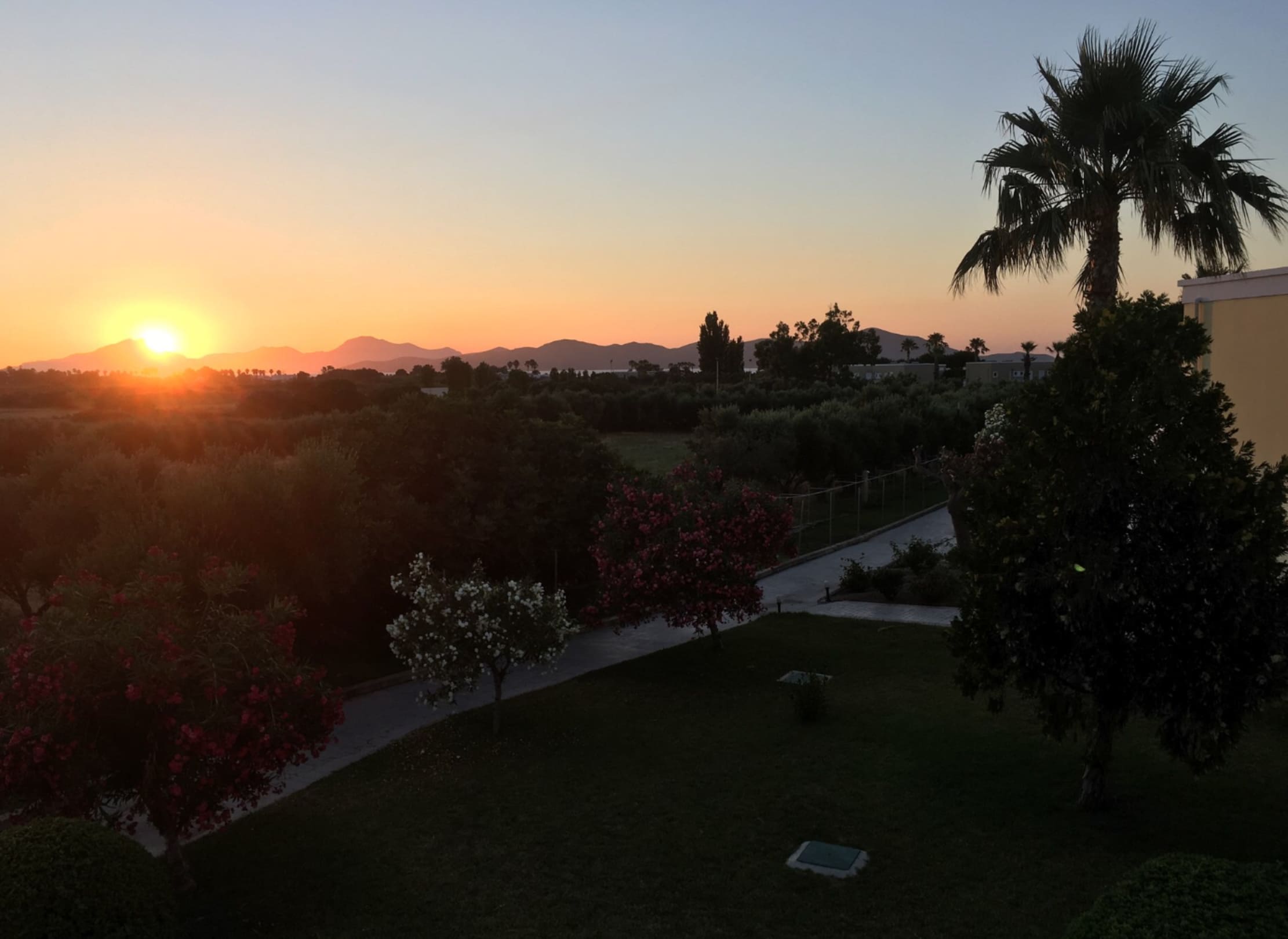 Sonnenuntergang vom Hotelzimmer aus gesehen. Im Hintergrund sieht man auch das Meer.