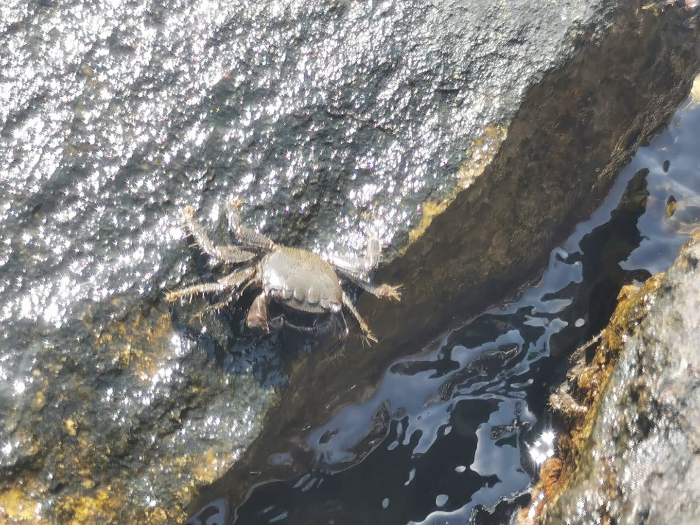 Viele Krabben zwischen den Steinen am Steg