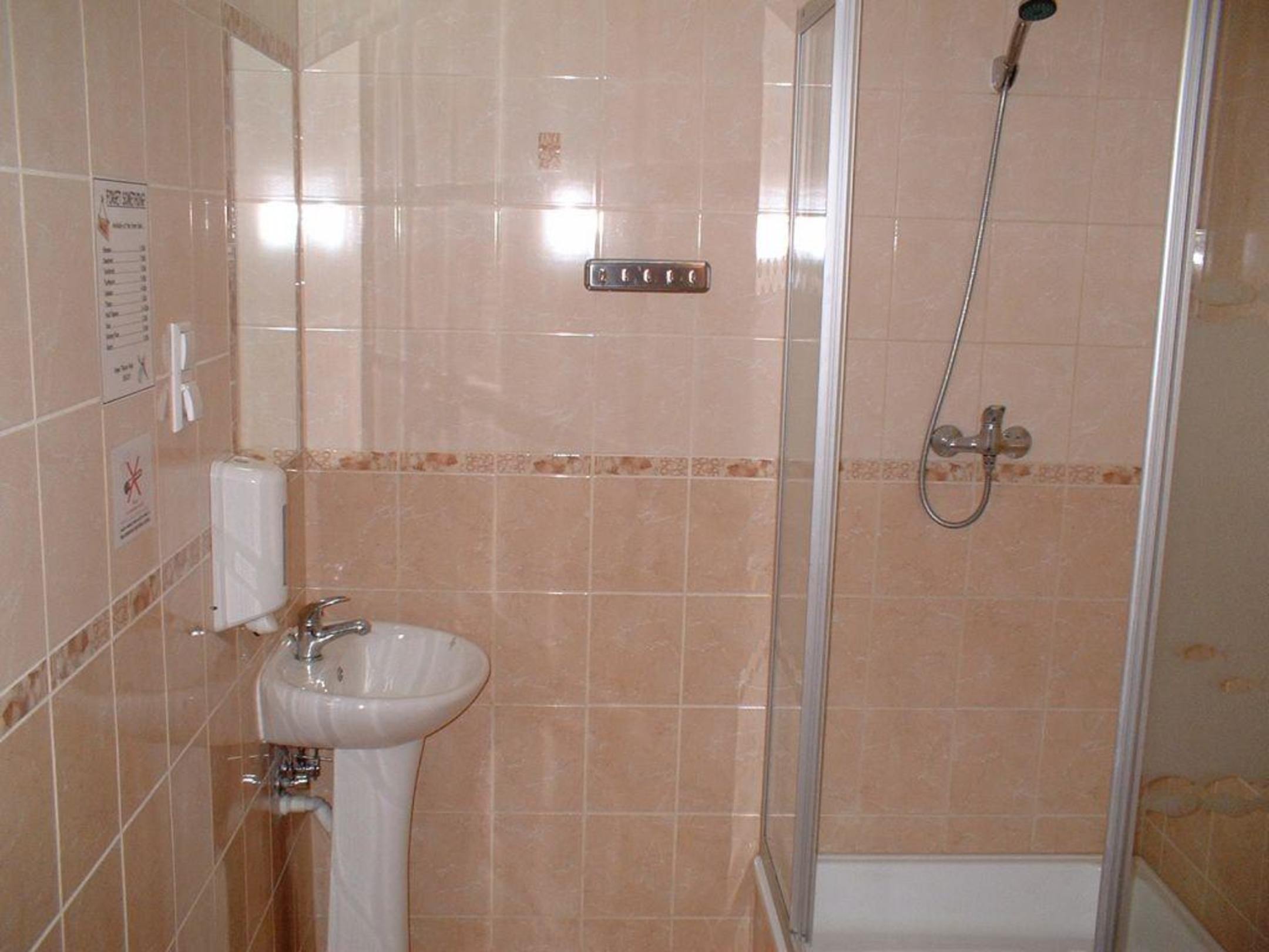 geräumiges Bad / WCLinks das Waschbecken und daneben ein Zettel auf dem steht was wieviel kostet (z.B. extra Seife, Handtuch, OBs usw.) und rechts die Duschkabine mit Glaswänden. In der Mitte ein paar praktische Haken.