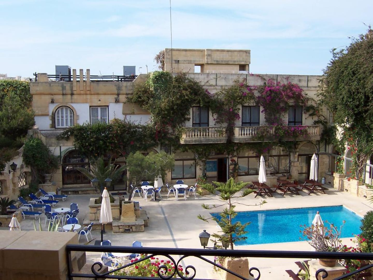 Hier blickt man auf das Hauptgebäude und einen der Pools.