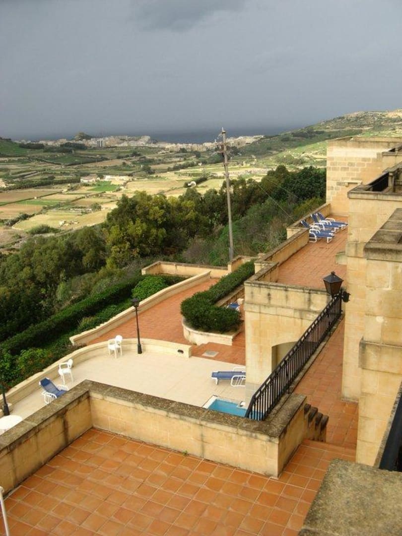 Blick von der Terrasse übers Tal zum Meer