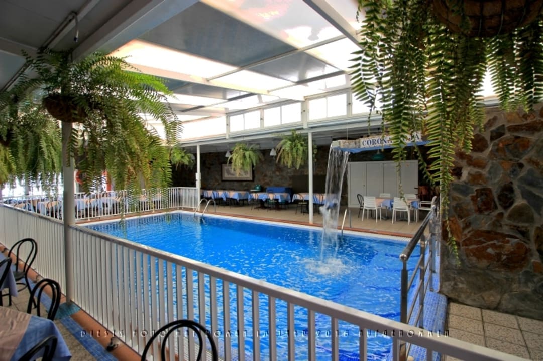 Blick über den Innenpool zu weiteren Tischen und Stühlen des erweiterten Sitzbereichs des Hotelrestaurants. Der "Wasserfall" ist nur während der "Öffnungszeiten" des Innenpools eingeschaltet.