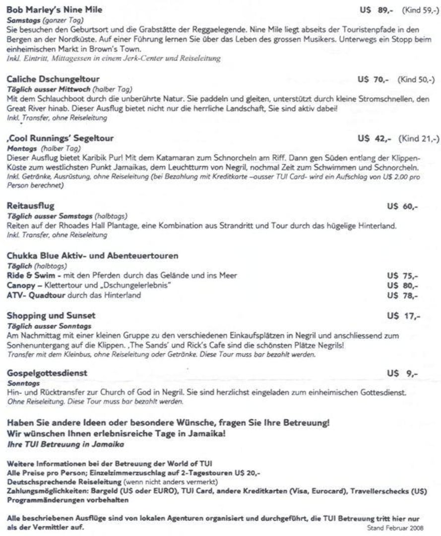 angebotene Ausflüge von TUI