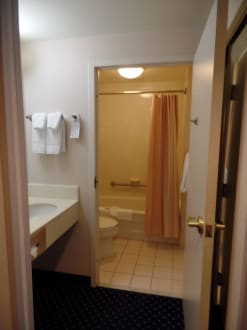 Vorraum mit Waschtisch und Toilette mit Dusche