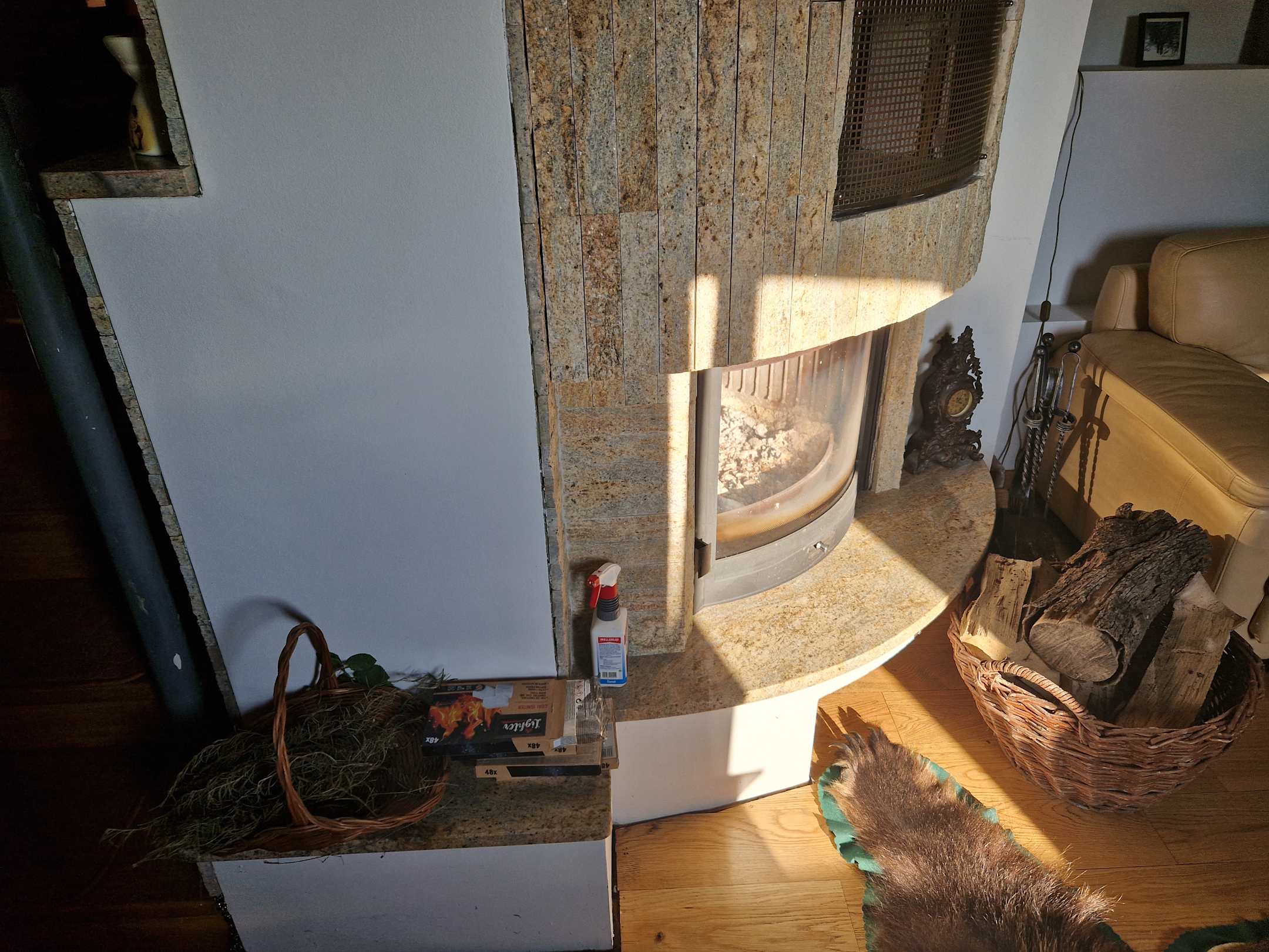 Wohnzimmer mit Trophäen und Kamin