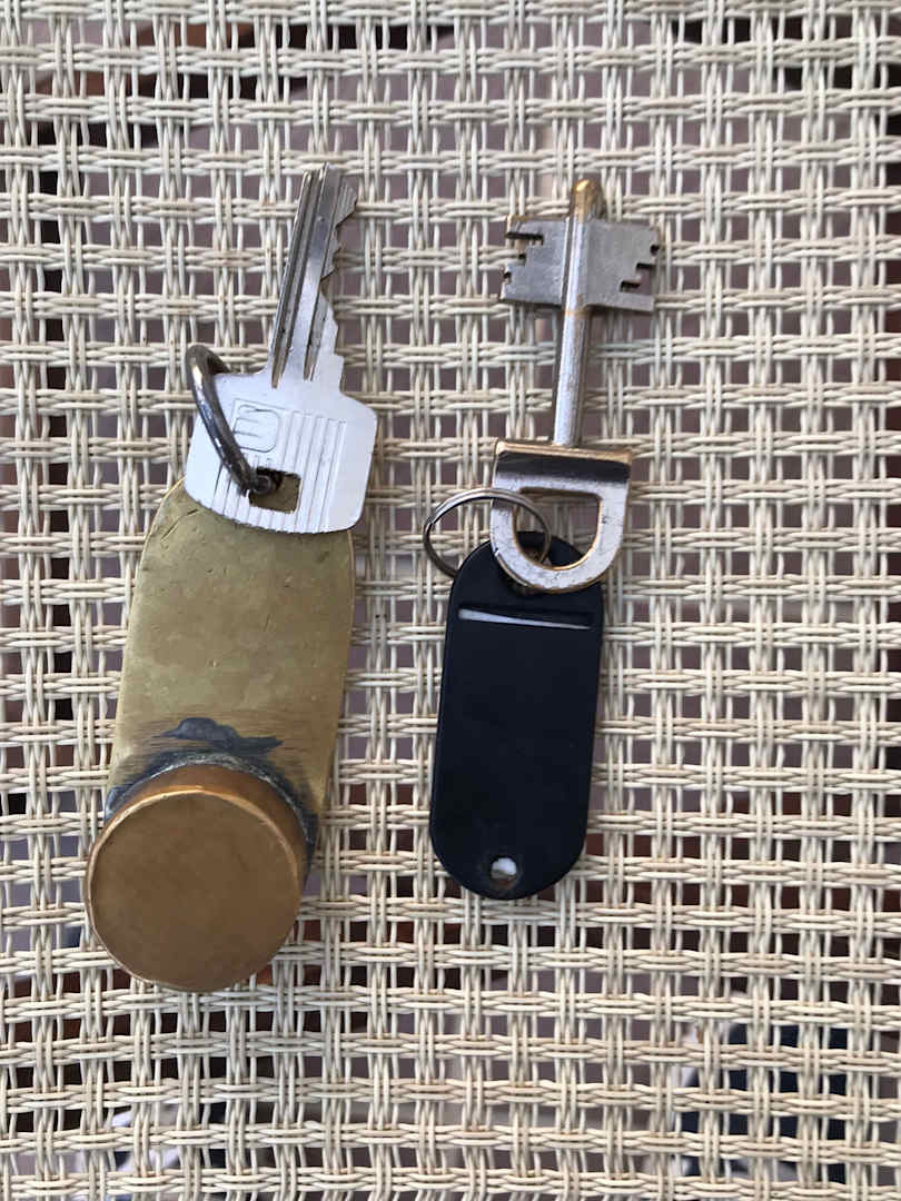 Zimmer und Safeschlüssel. Sehr groß und unpraktisch. Kein Chip oder Zahlenschloss wie bei modernen Hotels