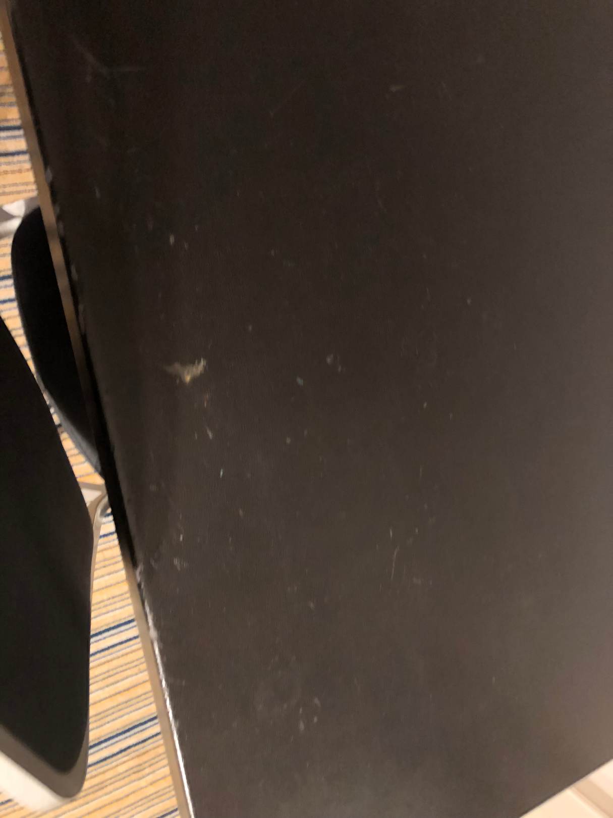 Tisch an dem das Kunstleder abblättert und sich Dreck sammelt.