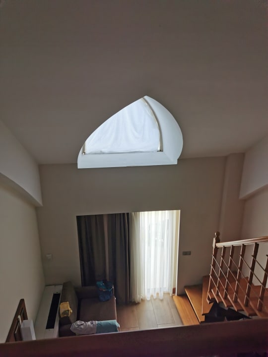 Oberes Fenster mit nachträglich angebrachter Verdunkelung. Leider nur wenig Effekt! Leider haben wir es bei der Buchung nicht beachtet, da die Fenster von außen geschlossen aussehen. Wer im hellen gerne schläft, ist hier richtig.