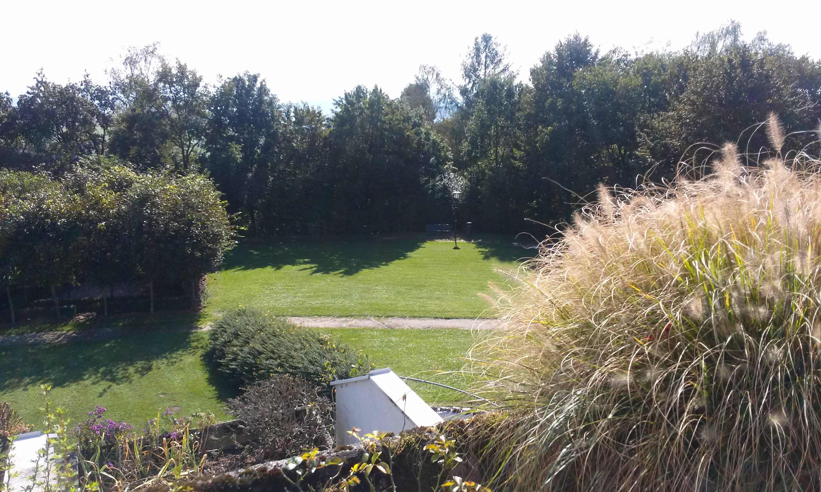 Blick von Balkonterrasse aus Garten