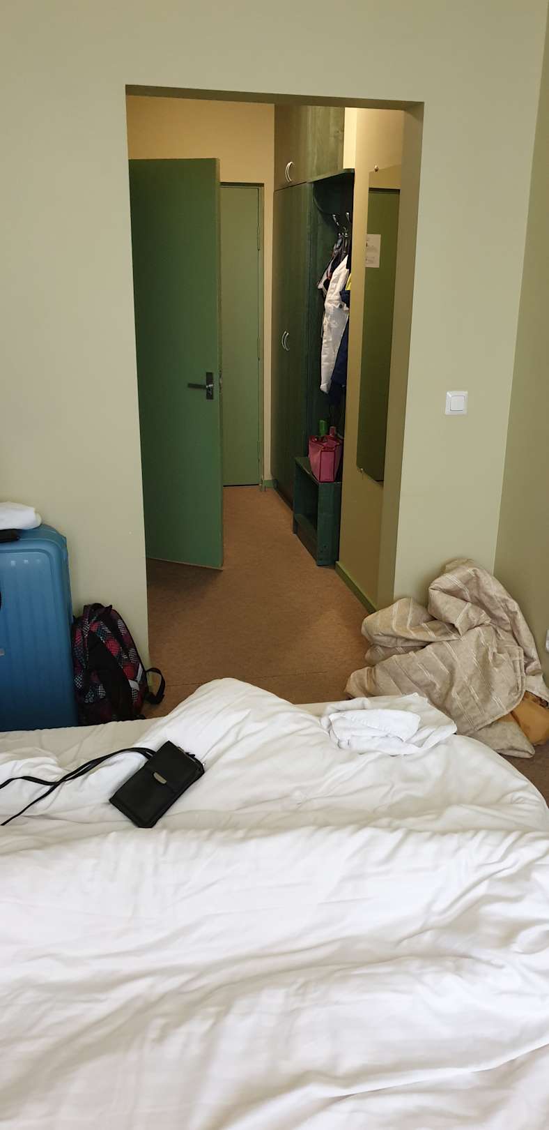 Flur im Zimmer. Links ins Bad, rechts und hinter der Bad-Tür sind Schränke