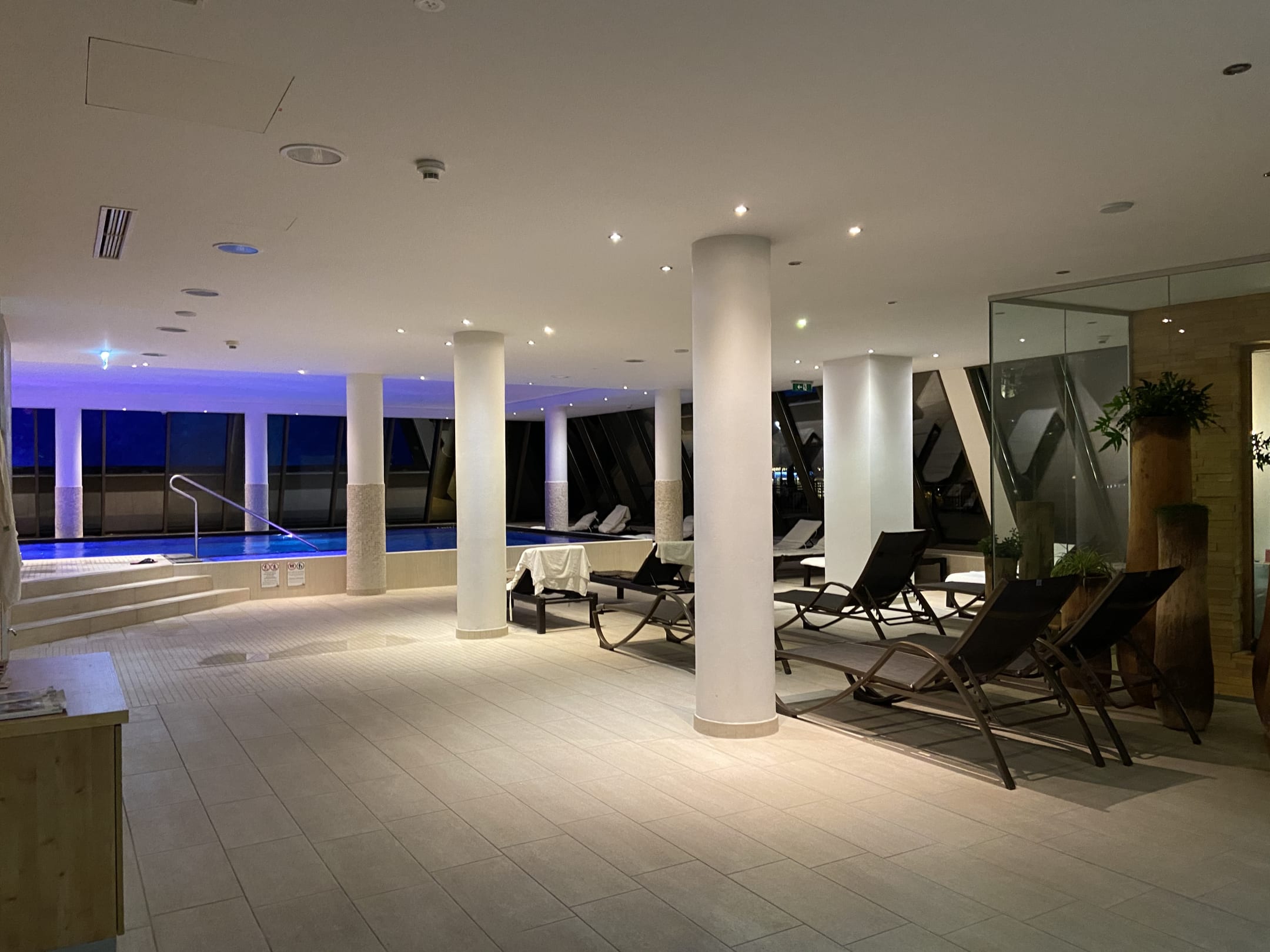 Wellnessbereich mit Indoorpool im Hintergrund