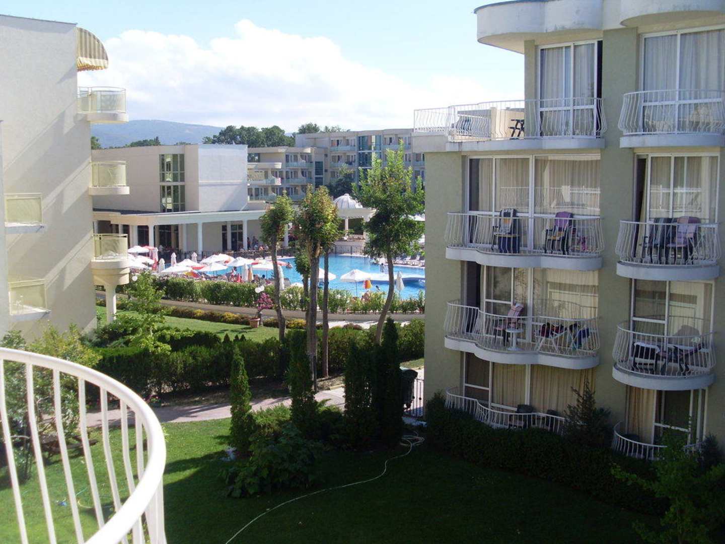 Ausblick vom Balkon zum Pool.