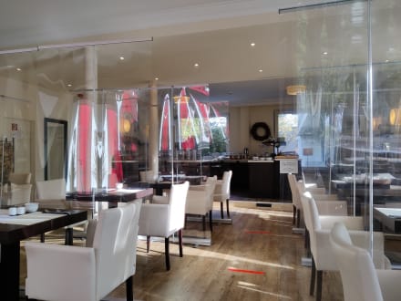 Der Frühstücksraum mit Schutzmaßnahmen gegen Corona