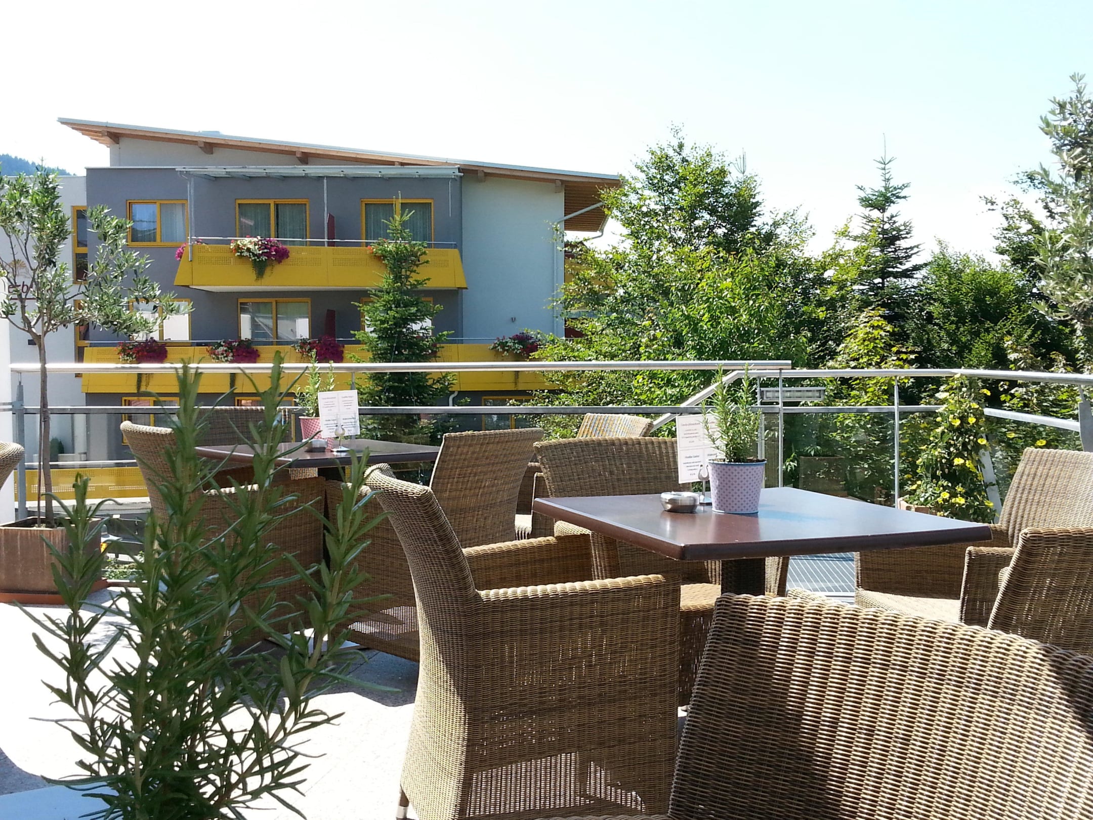 Terrasse mit Blick auf einen weiteren Teil des Hotels