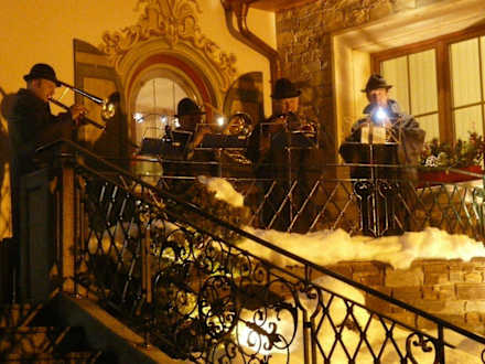 Bläsergruppe vor dem EingangEmpfang durch eine Bläsergruppe nach einer Fackelwanderung vor dem Eingangsbereich