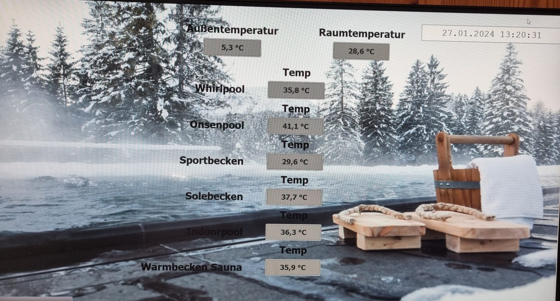 Wellnessbereich, Angabe der Temperaturen der Pools