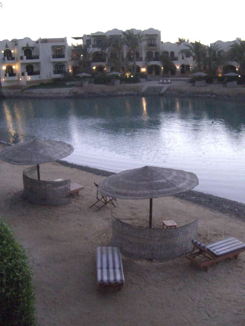 Lagunenstrand und Hotel in Abendstimmung